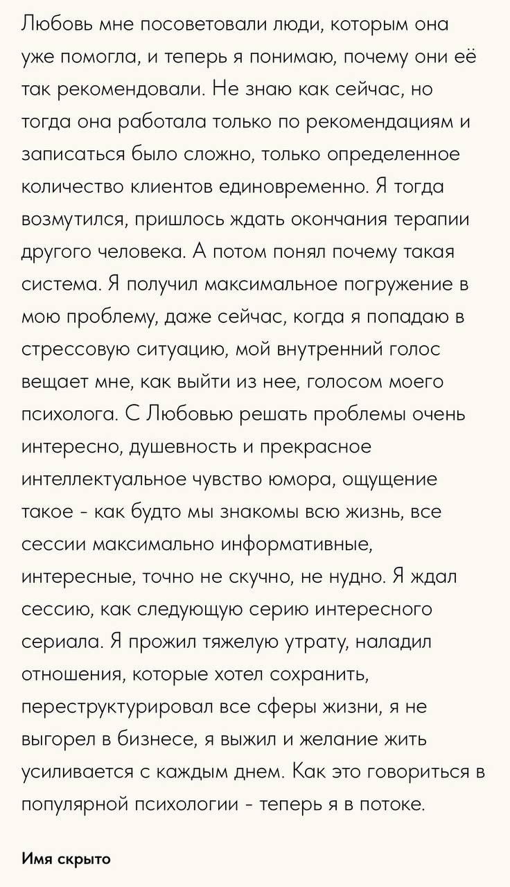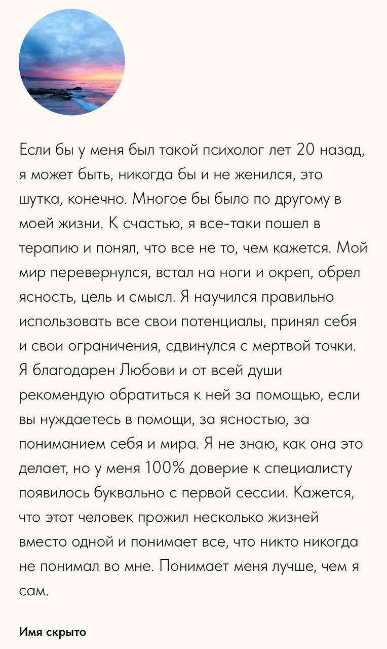 Вы получите конфиденциальное, безоценочное пространство, где можно быть абсолютно искренним. Я действую в строгих профессиональных рамках, моя цель — ваше благополучие.