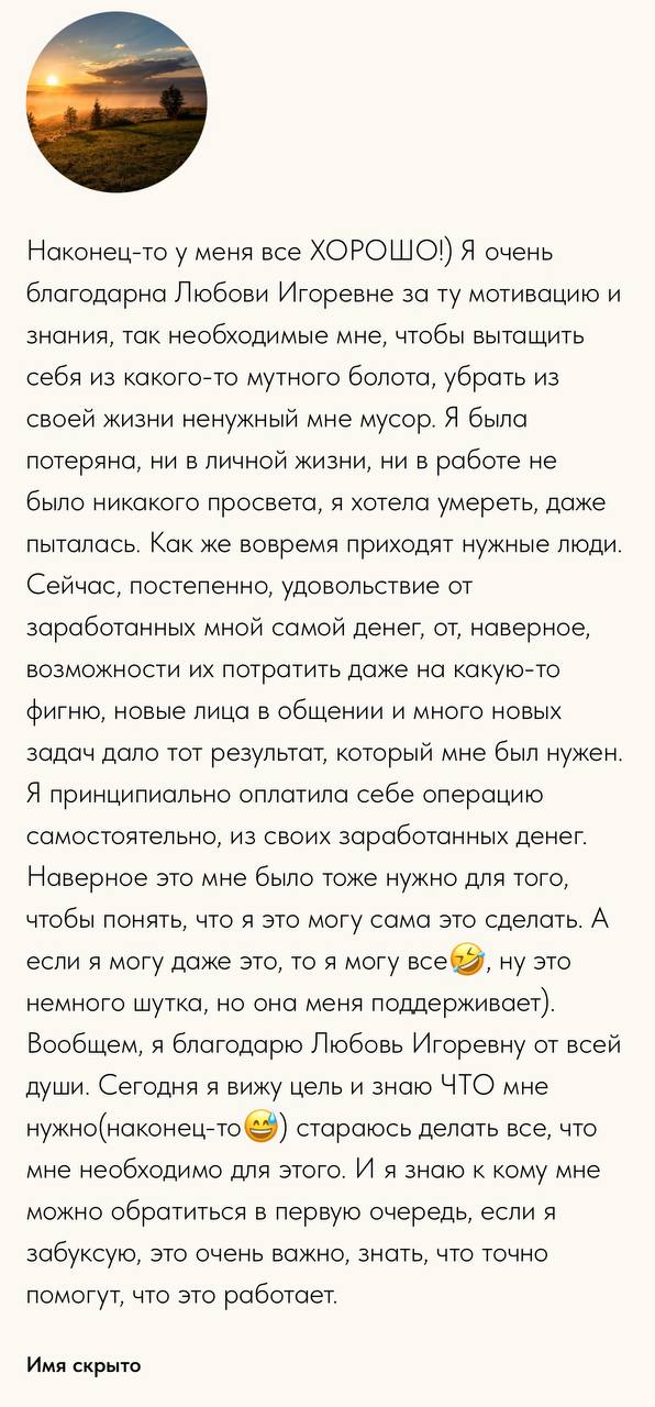 · Главное достижение (слова клиента): «Я наконец-то поверил врачам. И, что важнее, я снова поверил собственному телу. Оно не мой враг, а союзник. Я перестал жить в будущем, где обязательно должен был заболеть, и начал жить в настоящем. Я снова чувствую себя свободным».